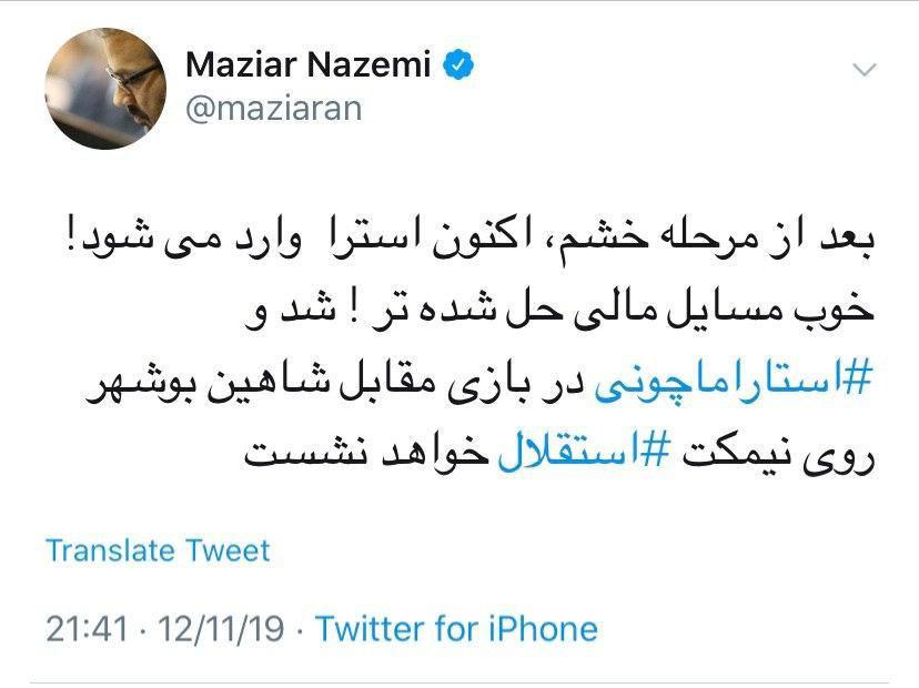 مازیار ناظمی، با انتشار توئیتی مدعی شد استراماچونی مقابل شاهین روی نیمکت استقلال خواهد نشست.