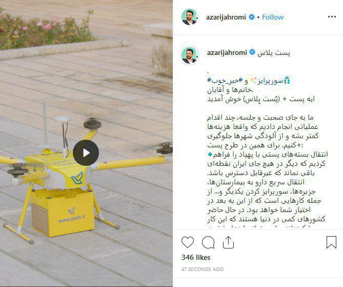 انتقال بستههای پستی با پهپاد را فراهم کردیم که دیگر در هیچ جای ایران نقطهای باقی نماند که غیرقابل دسترس باشد. انتقال سریع دارو به بیمارستانها، جزیرهها، سورپرایز کردن یکدیگر و... از جمله کارهایی است که از این به بعد در اختیار شما خواهد بود. در حال حاضر کشورهای کمی در دنیا هستند که این کار را کردهاند. ما میتوانیم! خدا وقت به همهی جوانان ایرانی برای این دستاورد!