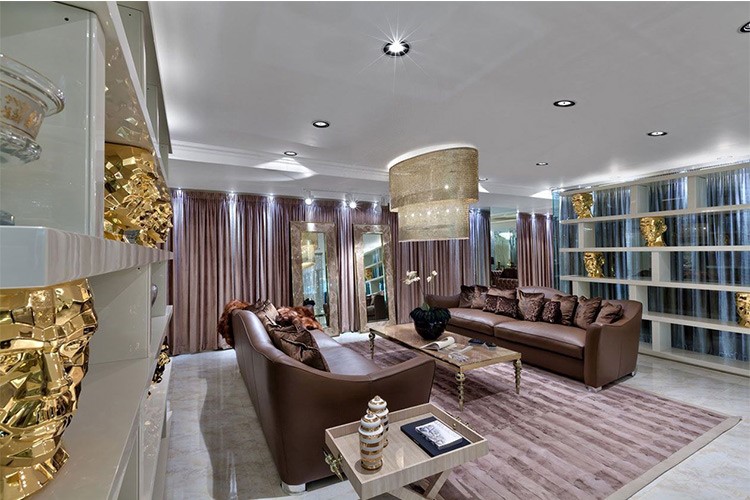 یکی دیگر از ایده پردازی های که به منظور زیبا سازی فضای داخلی مورد استفاده قرار می گیرد طراحی با تم سفید طلایی است. در تصویر ارائه شده دیوارهای اتاق با استفاده از تم طلایی طوسی با ستون ها و آینه های طلایی دیزاین شده است. کف پوش نیز با تمی طلایی رنگ پوشش داده شده است که حضور وسایل دیگر در فضا را زیبا تر جلوه داده است. همان طور که همیشه اشاره شده استفاده از صندلی های تکی خود به تنهایی می تواند یکی از ایده ال ترین دکوراسیون ها را برای شما فراهم سازد. همچنین شما می توانید با استفاده از میز های عسلی طلایی رنگ در کنار آباژورهای طلایی یک فضای کاملاً زیبا را طراحی کنید. مطلبی که قابل تأمل است این است که دو تم رنگی مشکی طلایی و طلایی سفید هر کدام به شکلی، زیبایی مخصوص به خود را دارند. تم سفید نور بیشتری را در فضا پیاده می کند و ایده پردازی مشکی تم حاکم در محیط را قدری دنج تر به نمایش می گذارد. شما می توانید بر حسب علاقه و نیاز خود یکی از دو ایده پردازی ارائه شده را مورد استفاده قرار دهید.