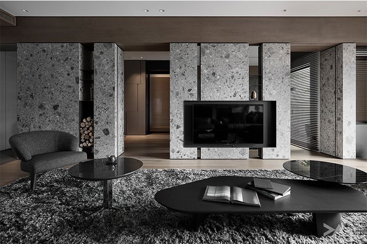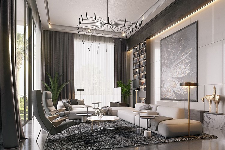 برای رسیدن به متفاوت ترین دیزاین باید از وسایل زیبا ولاکچری بهره گرفت. برای نمونه به ایده پردازی تصویر ارائه شده دقت کنید. تم سفید طوسی با لوازم دکوری طوسی تیره سه رنگ اصلی این فضا به شمار می آید. استفاده از پرده های سفید مشکی و کتابخانه مشکی و فرش مشکی کف اتاق دیوار و کف پوش را با رنگ تیره پوشانده است. از سوی دیگر مبل ال مانند با ترکیب صندلی های تکی بسیار لوکس که از تم سفید با کوسن های طوسی بهره گرفته شده است ایده پردازی محیط اتاق نشیمن را به انجام رسانده است. همان طور که در ابتدا اشاره شد برای لوکس تر جلوه دادن دکوراسیون داخلی می توان از لوازم دکوری طلایی بهره گرفت. همچنین از قاب های دکوری هم رنگ در فضا می توانید برای زیبا تر شدن ایده پردازی خود کمک بگیرید.