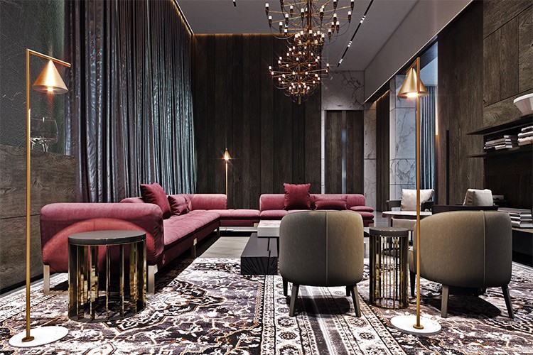 استفاده از رنگ قرمز برای متفاوت تر جلوه دادن دکوراسیون داخلی بهترین انتخاب است. شما می توانید با کمک گرفتن از رنگ قرمز و طلایی یکی از بی نظیر ترین طرح ها را برای فضای داخلی منزل یا محیط کار خود مدنظر قرار دهید. همیشه ترکیب رنگ طلایی با رنگ قرمز و مشکی سبب لوکس تر جلوه دادن فضا می شود. همان طور که در تصویر ارائه شده مشاهده می کنید از دو رنگ طوسی و قرمز برای دکور کردن سرویس مبل استفاده شده است. باید بگویم رنگ طوسی با هر رنگی که شما تمایل داشته باشید به خوبی ست می شود. رنگ طوسی یکی از رنگ های خنثی است که همیشه برای ایده پردازی به سبک رنگی نیز استفاده می شود. با استفاده از فرش های که تقریباً تم قرمز به خود گرفته است در یک فضای تیره رنگ طرحی بسیار مدرن فراهم شده است. در نهایت برای جلوه دادن به این کار هنری بی نظیر از دو آباژور طلایی، میز عسلی طلایی مشکی و لوستر طایی مشکی نیز کمک گرفته شده است.