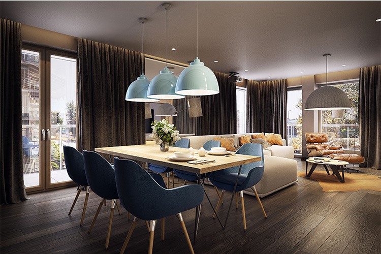 استفاده از رنگ ها در ایده پردازی های مدرن باید اصولی و درست دنبال شود تا به نتیجه دلخواه دست پیدا کنید. همان طور که در تصویر مشاهده می کنید از چند رنگ متضاد بدون در نظر گرفتن تم رنگی استفاده شده است که خود به زیبا سازی فضا بسیار کمک کرده است. صندلی های آبی تیره همراه با لوسترهای فانتزی آبی روشن که به خوبی سایه و روشن ترکیبی را فراهم کرده است. از سوی دیگر مبل ال مانند سفید با کوسن های خردلی یک دکوراسیون متفاوت را در انتهای سالن حاکم کرد است. این دیزاین به سه بخش میز نهار خوری، مبل راحتی و صندلی تکی لوکس تقسیم شده است. هر کدام از بخش ها با یک تم رنگی اما به درستی و با درایت انتخاب شده است.