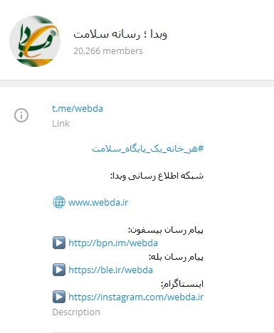 تنها کانال وزارت بهداشت در فضای مجازی کانال «وبدا» است. همچنین کاربران و مخاطبان می‌توانند برای اطلاع از توصیه‌های وزارت بهداشت از دیگر درگاه‌های ارتباطی رسمی این وزارتخانه به نشانی‌های زیر استفاده کنند.