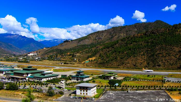این تنها فرودگاه بینالمللی کشور بوتان است که در ارتفاع ۲ هزار و ۲۳۶ متری و در درون یک دره ساخته شده است. پرواز از این فرودگاه فقط در هوای مناسب امکانپذیر است. تا سال ۱۹۹۰ باند پرواز این فرودگاه تنها یک هزار و ۴۰۰ متر طول داشت که بعدا به یک هزار و ۹۶۴ متر افزایش یافت.