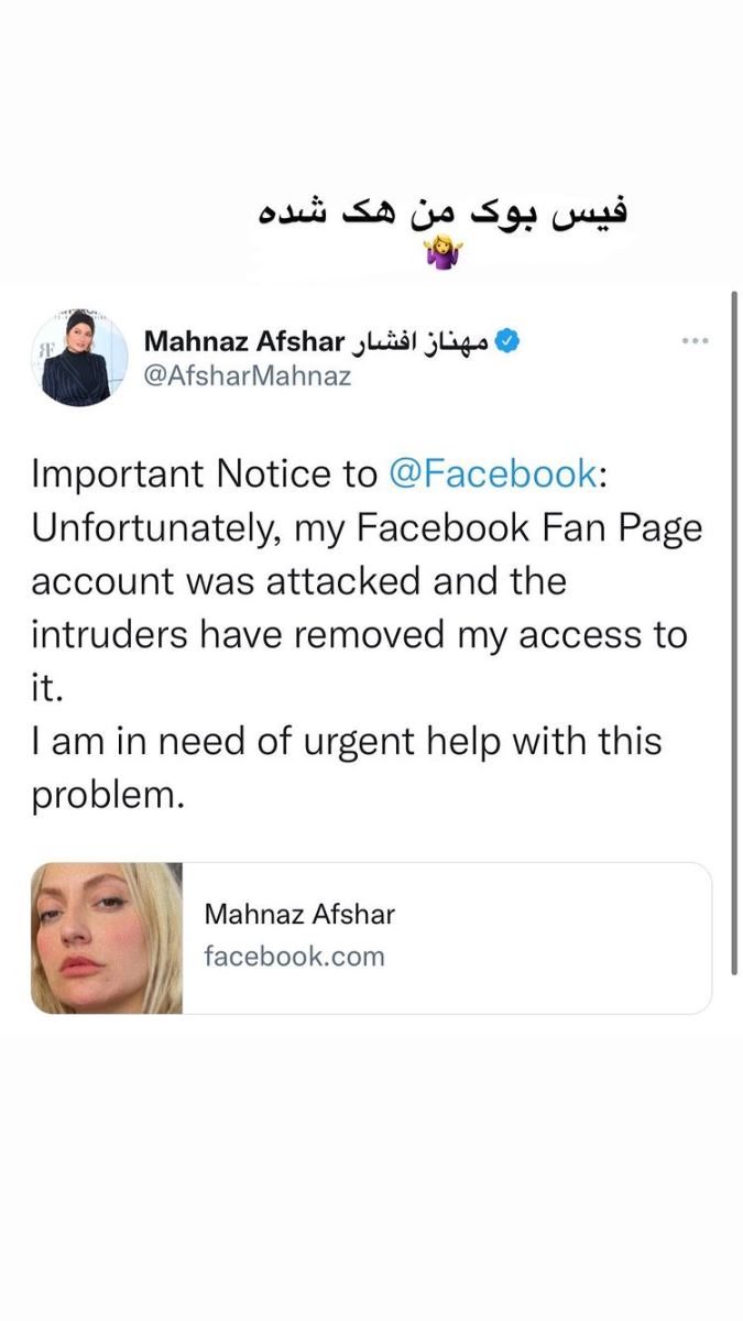 ساعاتی بعد از انتشار یک استوری مستهجن در صفحه اینستاگرام مهناز افشار، او اعلام کرد صفحه فیسبوکش هک شده است.