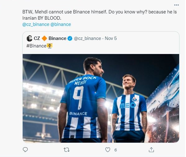 اما کار به همینجا ختم نشد و این صرافی در ایمیلی به کاربران ایرانی گفته بود که حتی اگر در ایران زندگی نمیکنند، بخاطر اینکه خون ایرانی دارند نمیتوانند از سرویس بایننس استفاده کنند. اما حالا مدیرعامل این صرافی، از عکس «مهدی طارمی»، بازیکن فوتبال ایرانی برای تبلیغ بایننس استفاده کرده است.