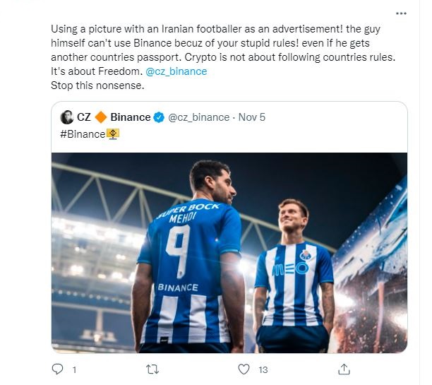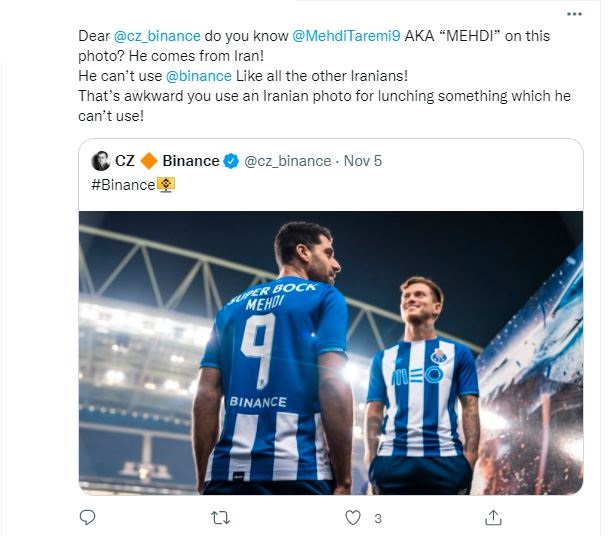 کاربر دیگری نوشته از تصویر بازیکن ایرانی برای تبلیغ صرافی استفاده شده که خودش نمیتواند بنابر «قوانین احمقانه بایننس» از آن استفاده کند، حتی اگر پاسپورت کشور دیگری را داشته باشد.