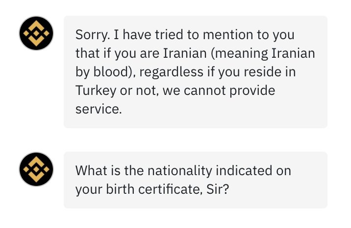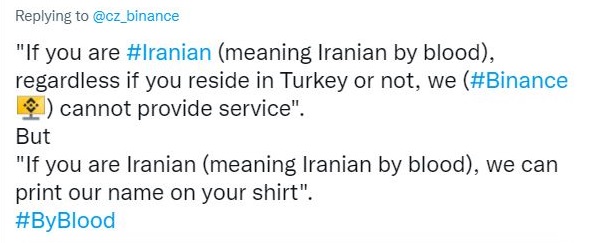 در ایمیل بایننس به کاربران ایرانی نوشته شده بود که چون ذاتا (By Blood) ایرانی هستند، این صرافی نمیتواند به آنها سرویس دهد؛ حتی اگر شهروند کشور دیگری هستند.