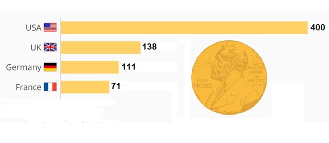 در تصویر زیر میتوان برترین کشورهای دریافت کننده جایزه نوبل را مشاهده کرد که در میان آنها کشور آمریکا با ۳۹۰ جایزه تا سال ۲۰۲۰ در صدر جدول برندگان قرار دارد و پس از آن بریتانیا با ۱۳۵ جایزه در رتبه دوم و آلمان با ۱۰۹ جایزه در رتبه سوم قرار دارد پس از آن فرانسه در رتبه چهارم قرار گرفته است.