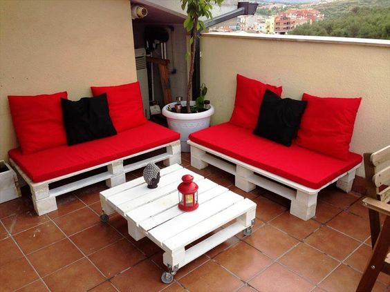 برای داشتن میز و صندلی در بالکن می توان از پالت ها یا جعبه های میوه و میتوان بهره گرفت .