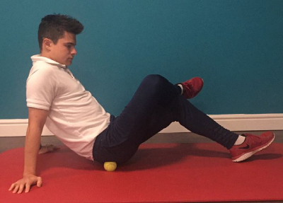 روی زمین بنشینید و توپ تنیس را در زیر یک باسن قرار دهید.