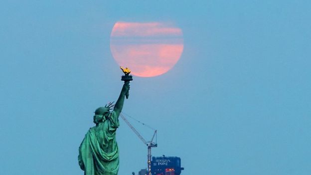 ابرماه کامل اعتدال بهاری از پشت مجسمه آزادی، نیویورک، ۲۰ مارس ۲۰۱۹
