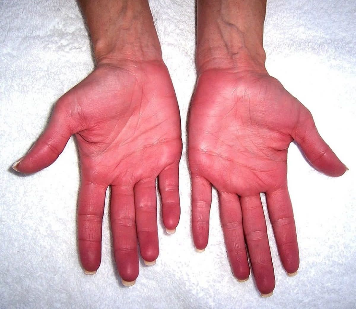 به عقیده پرشکان قرمز شدن کف دستها میتواند از علایم بیماری های کلیوی باشد.این قرمزی معمولاً در لبه بیرونی کف دست به وجود می آید علت احتمالی قرمزی کف دست ها بروز تغییر در توازن هورمونی است که باعث انبساط عروق خونی میشود رماتیسم مفصلی هم می تواند از علل قرمزی کف دست ها باشد اگر متوجه شدید بخش هایی از کف دستهایتان قرمز شده است لازم است به یک پزشک مراجعه کنید تا علت اصلی آن را متوجه شوید علاوه بر این تلاش کنید رژیم غذایی سالمی داشته باشید و از مصرف مشروبات الکلی بپرهیزید.