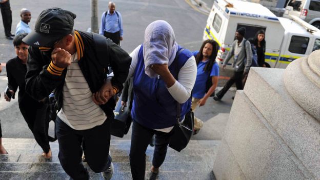 لاوونا سلیمان (با چهره پوشیده) برای محاکمه وارد دادگاه عالی کیپ تاون می شود