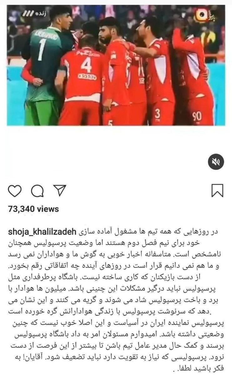 به گزارش بانک ورزش، شجاع خلیلزاده با نگران خواندن وضعیت این روزهای پرسپولیسِ صدرنشین در صفحه اجتماعی خود نوشت: در روزهایی که همه تیم ها مشغول آماده سازی خود برای نیم فصل دوم هستند اما وضعیت پرسپولیس همچنان نامشخص است. متاسفانه اخبار خوبی به گوش ما و هواداران نمی رسد و ما هم نمی دانیم قرار است در روزهای آینده چه اتفاقاتی رقم بخورد. از دست بازیکنان که کاری ساخته نیست. باشگاه پرطرفداری مثل پرسپولیس نباید درگیر مشکلات این چنینی باشد. میلیون ها هوادار با برد و باخت پرسپولیس شاد می شوند و گریه می کنند و این نشان می دهد که سرنوشت پرسپولیس با زندگی هوادارانش گره خورده است. پرسپولیس نماینده ایران در آسیاست و این اصلا خوب نیست که چنین وضعیتی داشته باشد. امیدوارم مسئولان امر به داد باشگاه پرسپولیس برسند و کمک حال مدیر عامل تیم باشند تا بیشتر از این فرصت از دست نرود. پرسپولیسی که نیاز به تقویت دارد نباید تضعیف شود. آقایان! به فکر باشید لطفا.