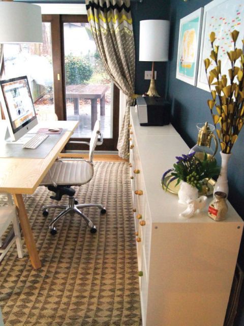 اتاق نشیمن یا سالن پذیرایی را با وسایلی مانند بوفه یا کتابخانه جدا کنید و در فضای خصوصی تر میز تحریرتان را قرار دهید. برای این کار می توانید از انواع وسایل جدا کننده فضا نیر بهره بگیرید.