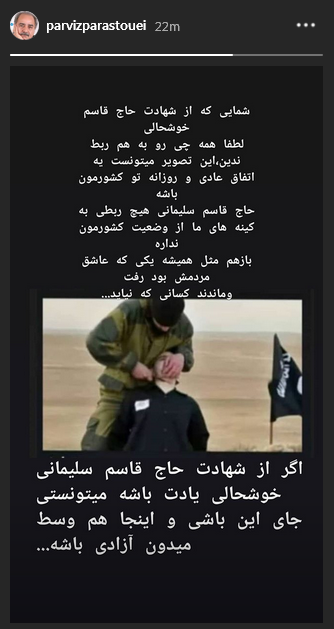 در پی شهادت سردار حاج قاسم سلیمانی، پرویز پرستویی، بازیگر سینما و تلویزیون نیز با گذاشتن عکسی از صحنه جدا کردن سر یک رزمنده از بدنش توسط داعش در صفحه شخصی خود نوشت: