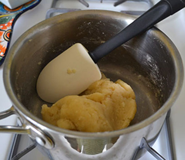 حدود 10 دقیقه هم زدن خمیر را روی حرارت ملایم ادامه دهید تا خمیر بپزد. پس از این که مایه آماده شد قابلمه را از روی شعله بردارید و اجازه دهید که خنک شود. پس از خنک شدن تخم مرغ ها را اضافه کنید. تخم مرغ را با مایه به خوبی مخلوط کنید تا خمیری نرم و لطیف به دست بیاید.