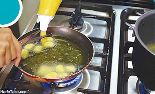 داخل قابلمه روغن بریزید، مقدار روغن باید به حدی باشد که زولبیا ها در داخل آن شناور باشند. قابلمه را روی شعله ملایم قرار دهید تا روغن داغ شود. مایه زولبیا را از داخل قیفی که ته آن سوراخ است داخل روغن بریزید و شکل های دایره ای و درهم به آن بدهید. برای راحتی کار می توانید مایه زولبیا را درون یک جا سسی قرار دهید تا راحت تر و سریع تر به زولبیا ها شکل دهید.