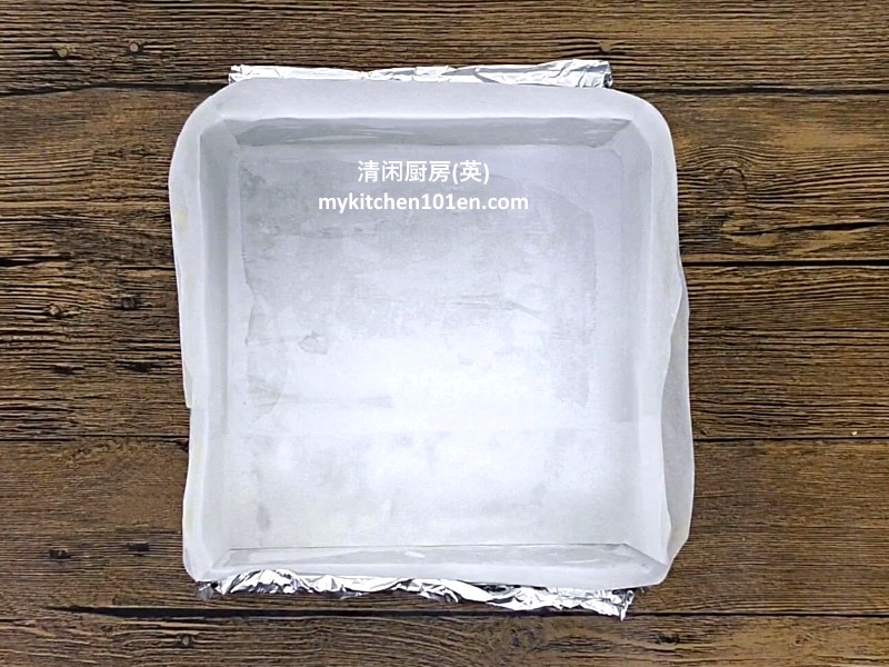 مرحله اول- قالب و دیواره های قالب مورد نظر(بهتر است مستطیلی باشد) را چرب کنید، کف و دیواره آن را با کاغذ روغنی شیرینی پزی بپوشانید. در مرکز یک فویل آلومینومی چند لایه دستمال کاغذی ضخیم آشپزخانه قرار می دهیم وسپس قالب را روی آن گذاشته و فویل آلومینیومی را کاملا روی دیواره ها و کفه بیرونی قالب کشیده و ثابت می کنیم.