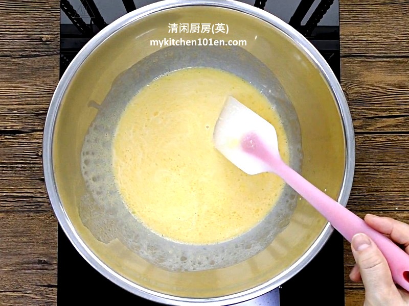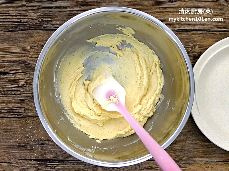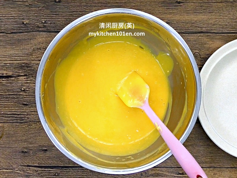 مرحله چهارم- در ظرفی دیگر، یک عدد تخم مرغ کامل و هفت زرده تخم مرغ را با چنگال هم میزنیم. و مرحله مرحله به مخلوط آرد و شیر و کره اضافه کرده و با دست به آرامی فقط مخلوط می کنیم.
