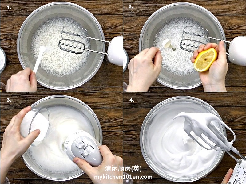 مرحله پنجم- در ظرفی دیگر سفیده ها را با دور کند همزن میزنیم تا کمی کف کند سپس نمک و آب لیموی تازه را میافزاییم. و دوباره به هم زدن ادامه میدهیم. وشکر را در چند مرحله اضافه می کنیم تا شکر تمام شود و باز به هم زدن ادامه میدهیم تا ماده به شکل فوم دربیاد و از طرف نریزد.