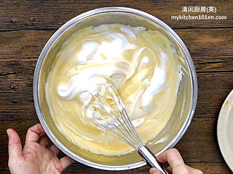 مرحله ششم- طی سه مرحله سفیده و شکر زده شده را به ماده قبلی اضافه کرده و به آرامی از پایین به بالا هم میزنیم.
