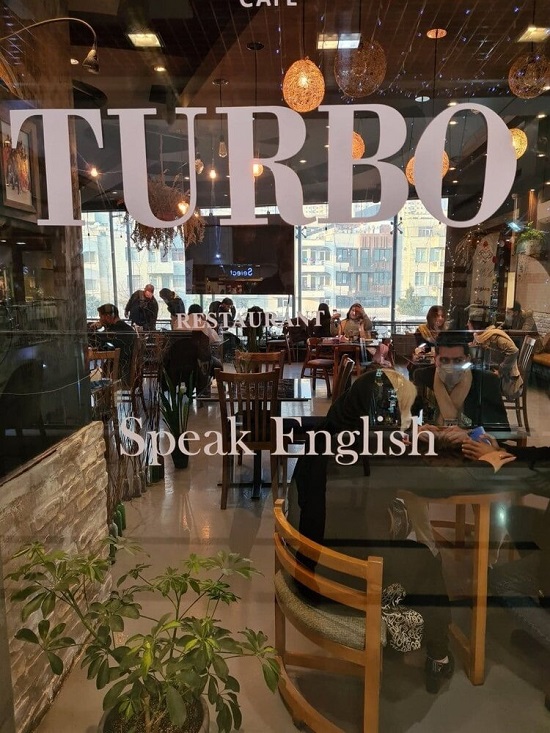 کافهای در سعادت آباد تهران در اقدامی عجیب زبان فارسی را در محیط کافه حذف کرده و روی شیشه نوشته است: Speak English یعنی انگلیسی حرف بزنید!