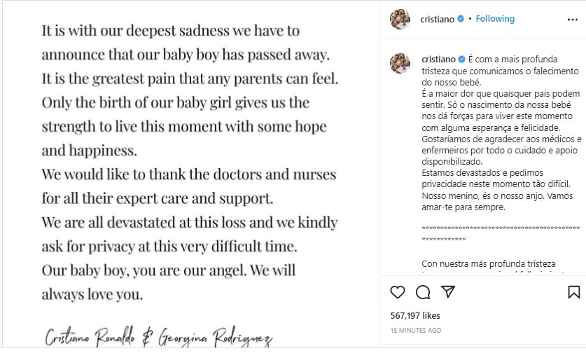 رونالدو با انتشار پستی در صفحه اینستاگرام خود نوشت: با نهایت اندوه مرگ فرزندمان را اعلام میکنیم. این بزرگترین دردی است که هر والدی ممکن است تجربه کند. فقط تولد دخترمان به ما قدرت میدهد که این لحظه را با امید و شادی زندگی کنیم. مایلیم از پزشکان و پرستاران برای مراقبتهایشان تشکر کنیم. ما احساس بسیار بد و تلخی داریم و در این دوره بسیار سخت، مایلیم حریم خصوصیمان حفظ شود. پسرم، تو فرشته ما هستی. تو را برای همیشه دوست خواهیم داشت.