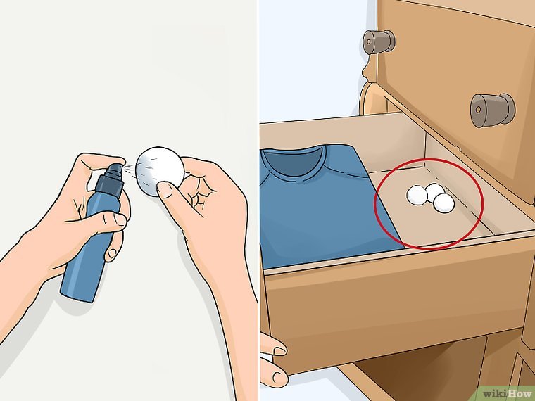 با استفاده از نخ یا پنبه، توپ هایی کوچک درست کرده، آن را با عطر یا اسانس خوشبو کنید و در کشوی لباس ها با کمد قرار دهید. توجه داشته باشید که این کار برای جلوگیری از برخورد مستقیم مایع عطرها با لباس صورت میگیرد.