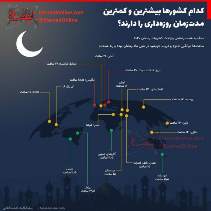 در اینفوگراف مدت زمان ساعات روزه داری در کشورهای جهان نمایش داده شده است.