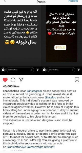 آزاده، همسر هیچکس، خواننده رپ مشهور ایرانی، پیج اینستاگرامی تتلو را بابت تمایل نشاندادن به رابطهجنسی با دختران زیر سن قانونی، به اینستاگرام ریپورت کرده، و کارزار ریپورت او را کلید زد. او در گزارش مستقیم خود به اینستاگرام، عنوان کرد که پیش تر هم این پیج به دلیل خشونت علیه زنان بسته شده بود اما مجددا شروع به فعالیت کرد، این بار به دلیل درخواست ملاقات تتلو با دختران زیر سن قانونی خواهان بسته شدن پیج تتلو شد.