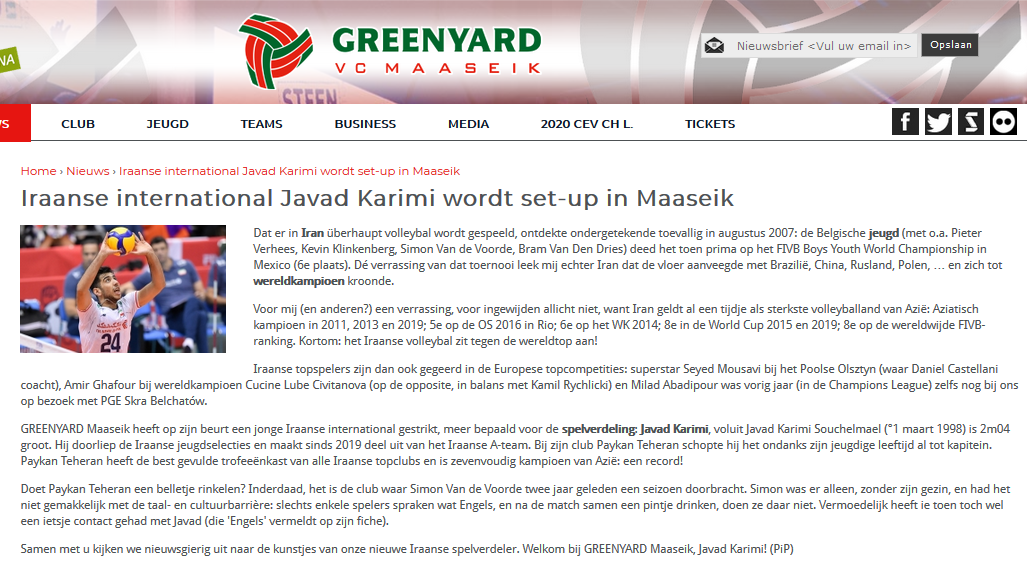 جواد کریمی پس از پیوستن به تیم والیبال گرین یارد ماسیک بلژیک با خوشآمدگویی این باشگاه مواجه شد.